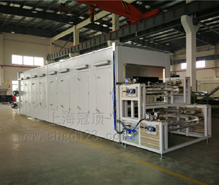 工業膜高溫固化爐,工藝流程要求如下:機器人上料→掃碼→自轉并向前輸送→恒溫固化→掃碼→自動下料至小車 1. 產品尺寸:尺寸直徑 201mm,長 1016mm 2. 產能: 12 支/H; 3. 爐內產品數量不少于 120 支; 4. 固化時間 4H,溫度常溫~+100℃; 5.分上下二層輸送帶,機器人上料,下料位頂緊釋放自動卸料至下料下車,進出工位定位精度±1mm; 6.產品橫向放置于輸送帶上輸送,自鎖機構可使得濾芯自轉并向前輸送,轉速 10-60rpm 可調節。 7.上料位-主線體自轉區前獨立自轉,上料時停止。 具體工業膜高溫固化爐設備工業參數請來電詳詢。